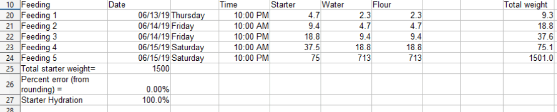As a "reality check" the spreadsheet shows the desired and actual amount of starter the feeding should produce, any error in the amount due to rounding, and the starter hydration.