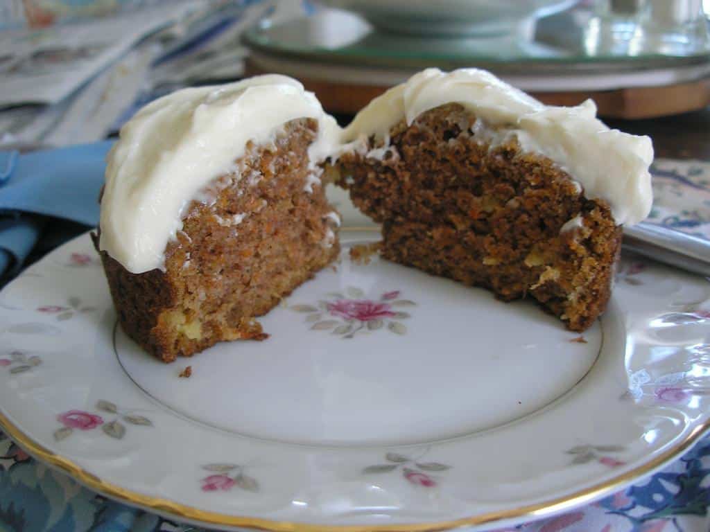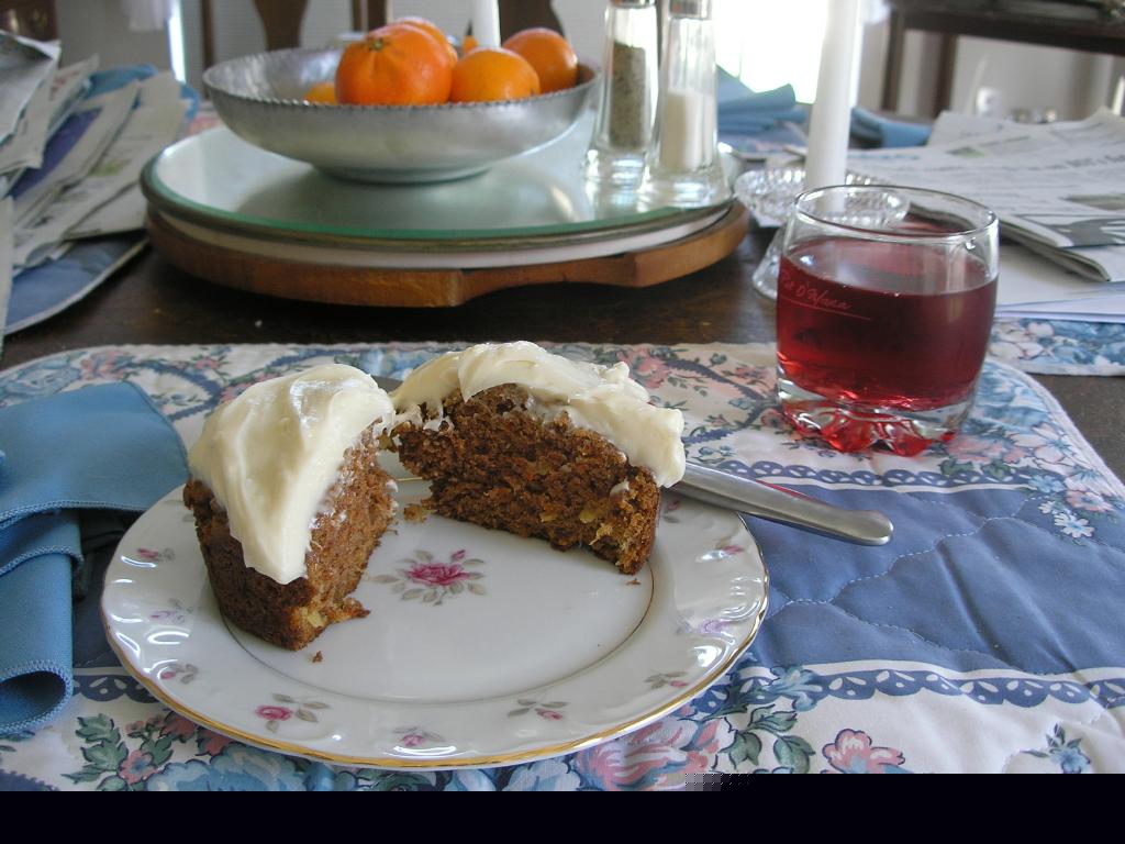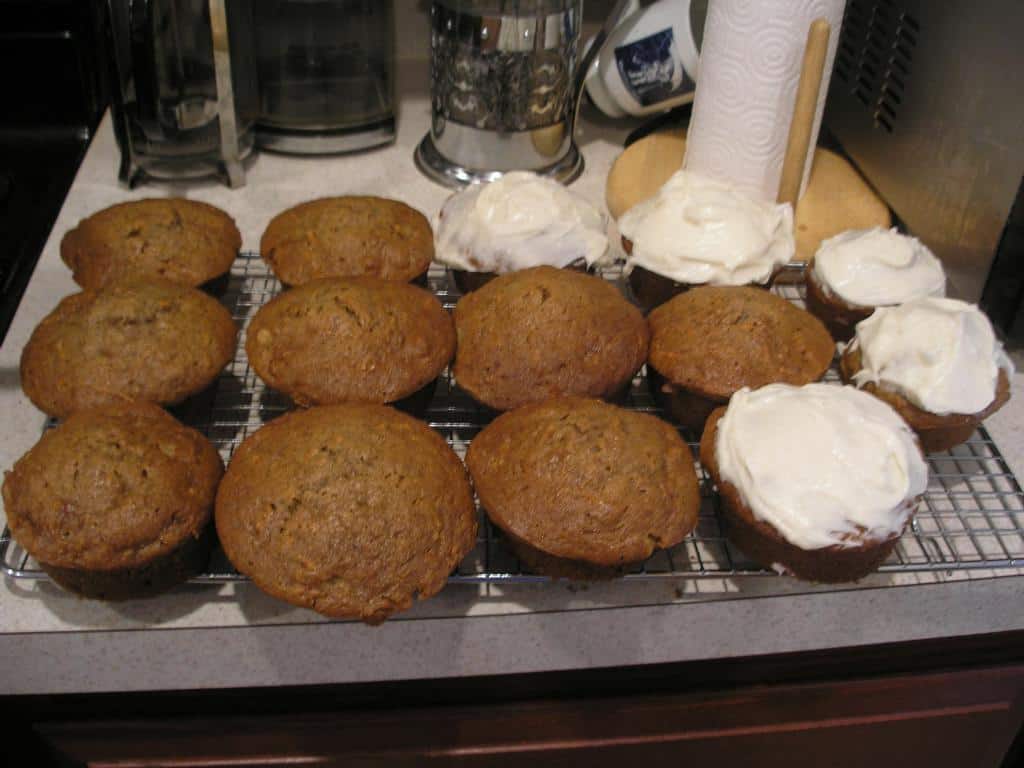 It's an easy recipe, though it was easier when we could call the food service company and buy bags of shredded carrots. If you can do that, you can avoid a minor hassle in peeling and shredding the carrots. But, it's worth it. While this will probably make a great cake, I have to confess I've never made this as a cake, only as mini-cakes and cupcakes, so your baking time will vary. Now then, here's the recipe, which will make about a dozen very large (8 ounce or so) cupcakes.