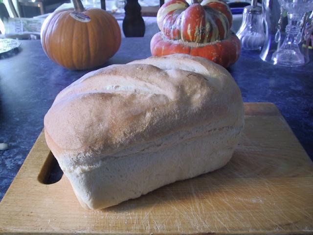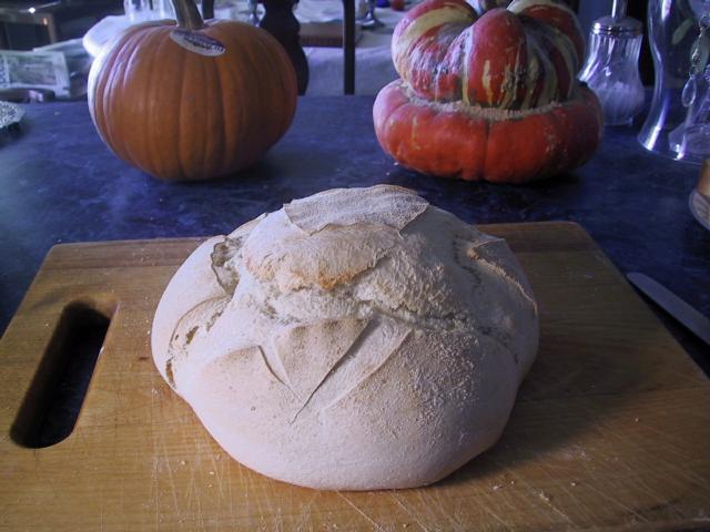 Our Three Stage French bread, or Pain au Levain, is usually interesting, though rarely very sour. This loaf is no exception. It surprised us by having a relatively minimal rise followed by a strong oven-spring, which is very unusual for this recipe. The bread had a wheaty with slightly sour aroma. The crust was nicely browned, chewy and thick. The crumb was very tight with small holes. The taste of the crumb delivered what the aroma promised, as usually happens. A first taste of wheat followed by a mild sour taste. While this loaf wasn't as sour as some other loaves made with other flours, it was quite pleasant.