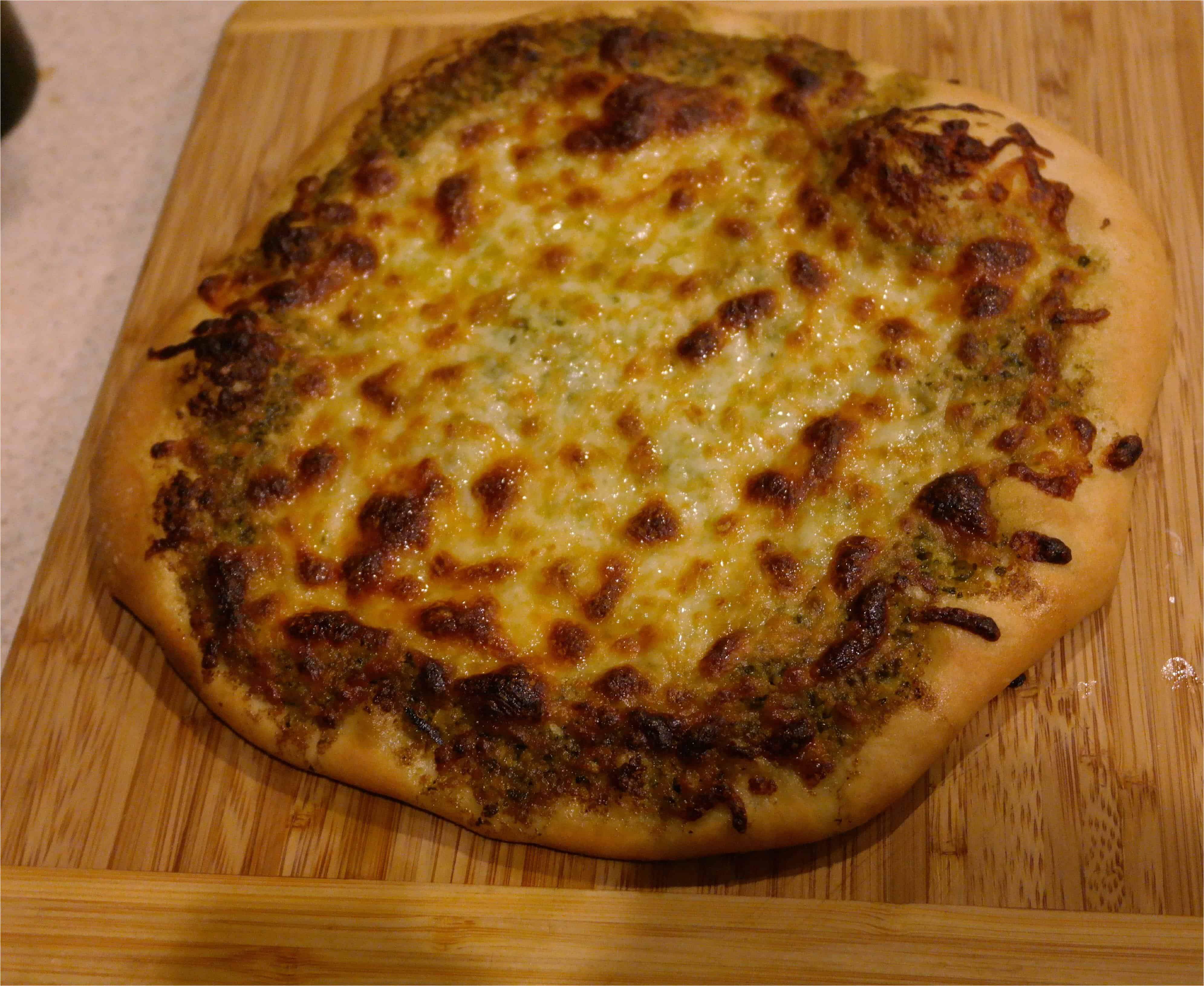 Basil pesto pizzaΒ Top the pizza with about 3 ounces of basil pesto,Our Pesto Pizza and then the cheese. We use bottled pesto from the grocery store - it tastes great and you can keep it in your pantry waiting for your next pizza emergency.
